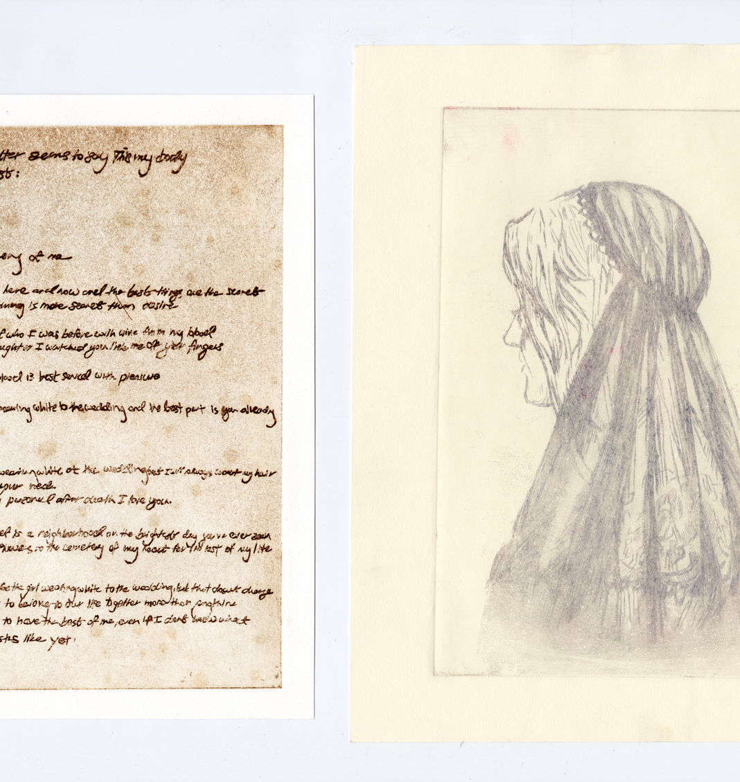 Love never dies despite the different versions of ourselves doing it often and dramatically. It is no coincidence the objects associated with both look strikingly similar. To love is to share grief. No Lovers, No Mourners, No Funerals is a multiple plate color intaglio series incorporating plates showing a bride, bridal bouquet ribbon, lovers eyes, victorian mourning jewelry, and my first piece of writing to ever make it into a print, a letter.